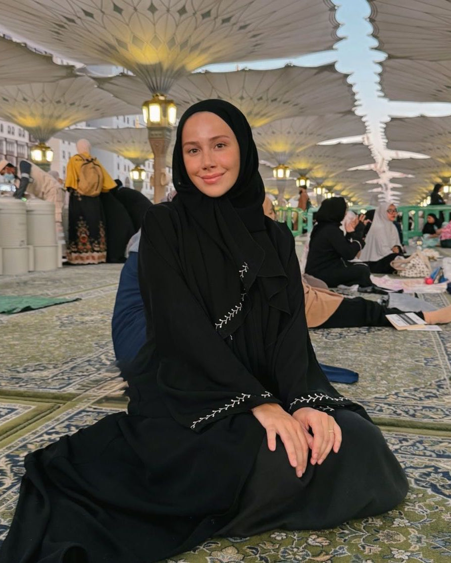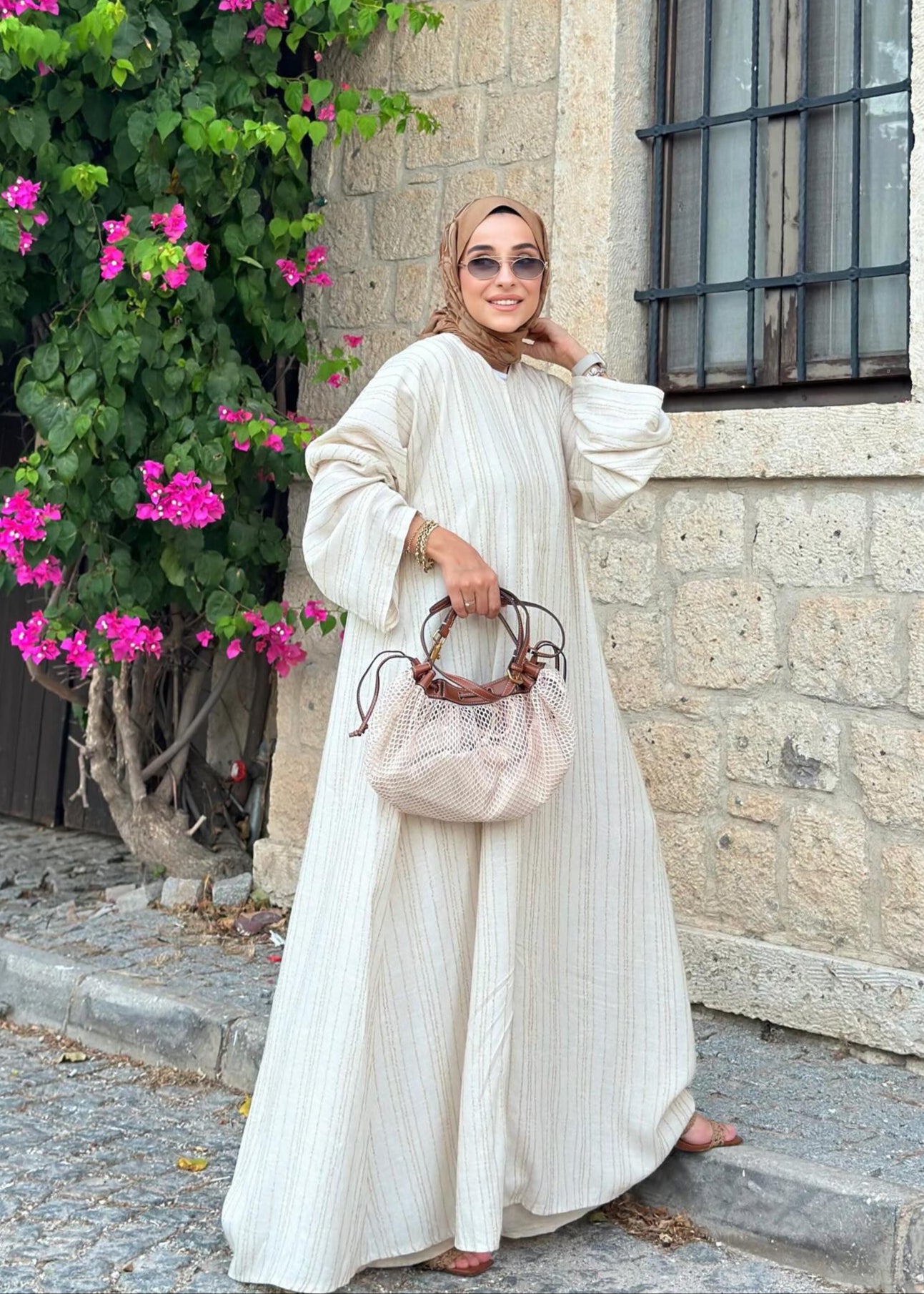 Tuğçe hanımın tercihi, sade şıklığıyla öne çıkan Sahra Bej Line Abaya oldu.