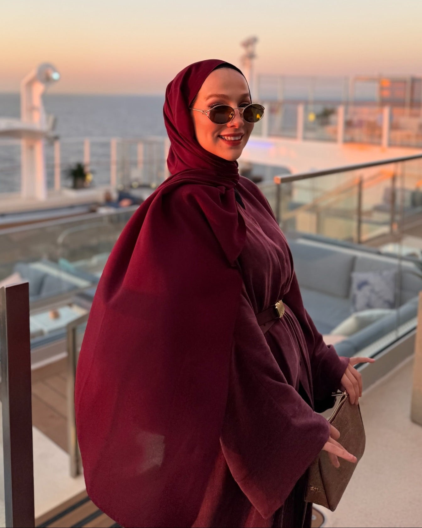 Betül Yıldırımın tercihi, doğallığı zarafefle buluşturan Bordo Bambu İpek Abaya oldu.