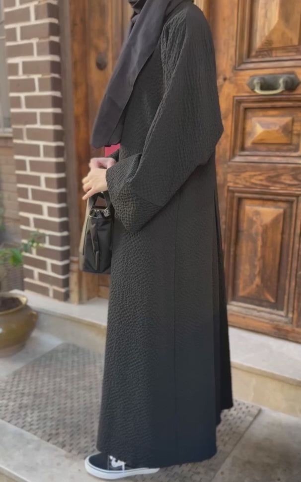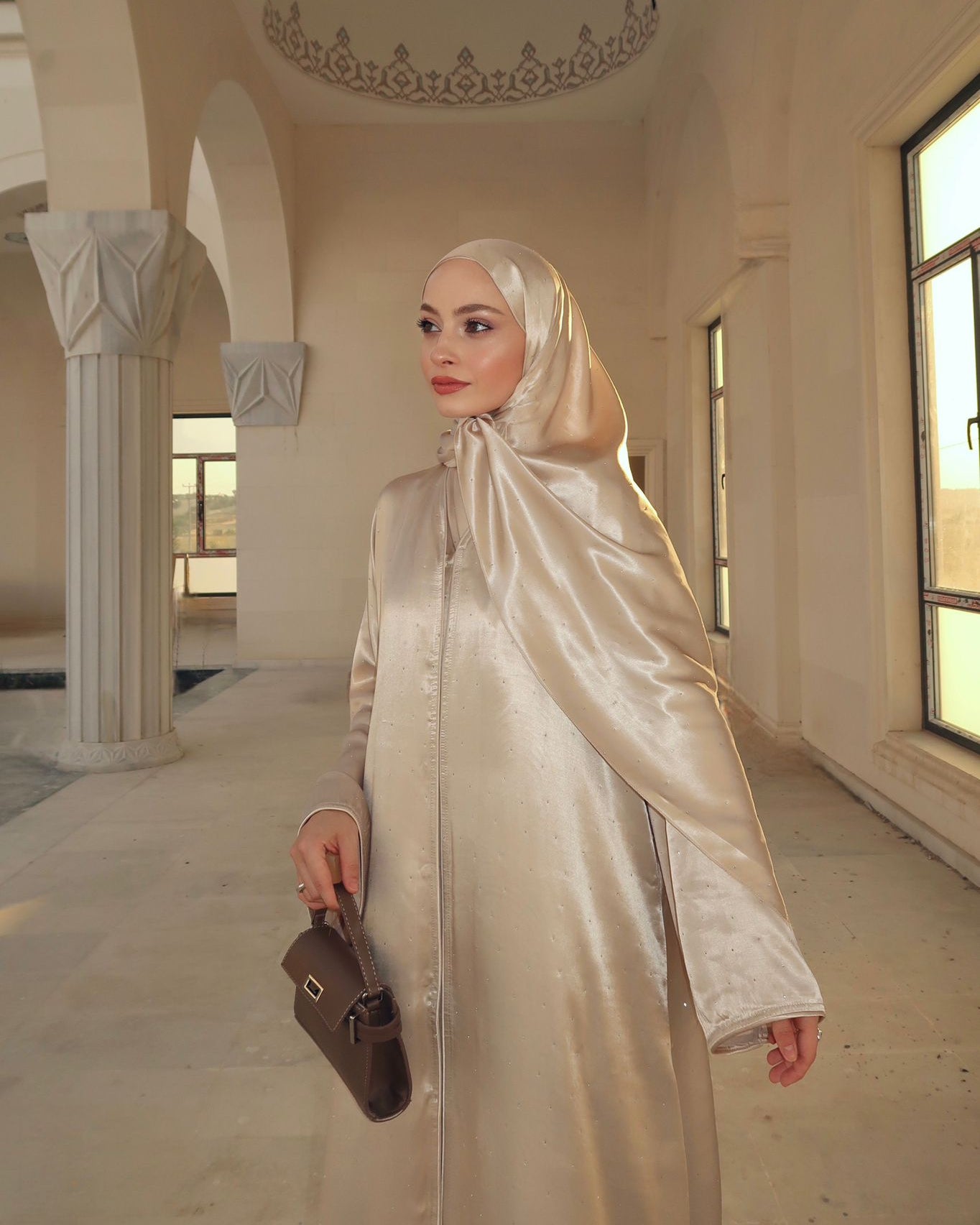 Taş baskılı özel kumaşıyla her adımda zarafeti ve ışıltıyı hissettiren bu abaya, özel günleriniz için özenle tasarlandı.